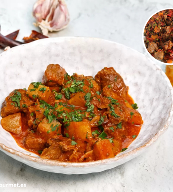 Condimentar: Riega generosamente con aceite de oliva virgen extra, espolvorea el pimentón dulce (o picante) y añade las hojas de laurel partidas.