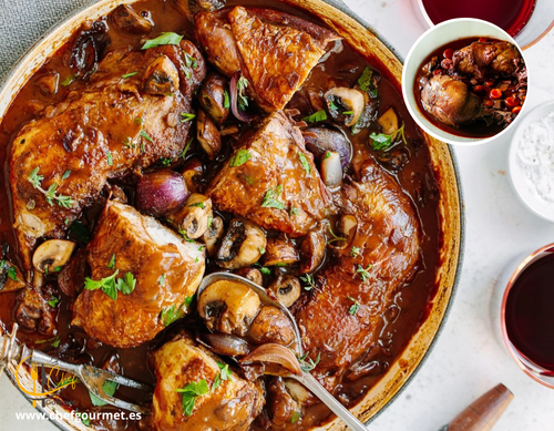 Descubre cómo preparar el auténtico Coq au Vin, un plato clásico francés de pollo cocinado lentamente en vino tinto con verduras y hierbas aromáticas. Perfecta combinación de sabores y texturas.