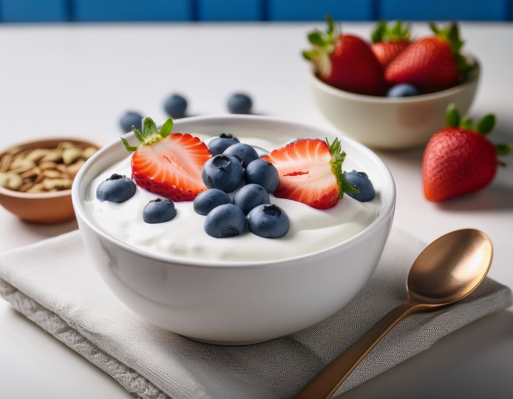 Coloca 150 g de yogur griego bajo en grasa en un bol.