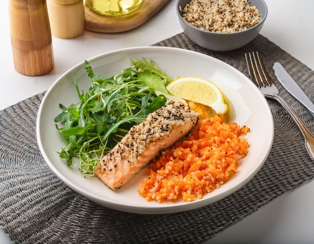 Almuerzo: Salmón a la Plancha con Quinoa y Ensalada