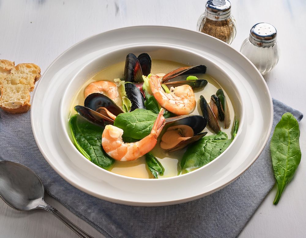 Cena: Caldo de Mariscos con Gambas, Mejillones, Espinacas y Ajo