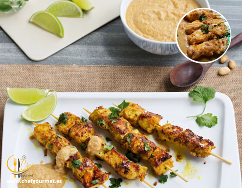 El Satay de Pollo con Salsa de Maní es una receta asiática tradicional que combina el sabor jugoso del pollo marinado con una salsa cremosa y especiada a base de maní. Esta preparación es ideal para compartir en reuniones, como aperitivo o plato principal. Las brochetas de pollo se marinan en una mezcla aromática de ajo, jengibre, cúrcuma, comino y cilantro, realzadas con un toque de salsa de soja y pescado. La salsa de maní, cremosa y ligeramente dulce, complementa a la perfección el sabor del pollo. Fácil de preparar, este plato es una opción deliciosa para explorar la riqueza culinaria del sudeste asiático.