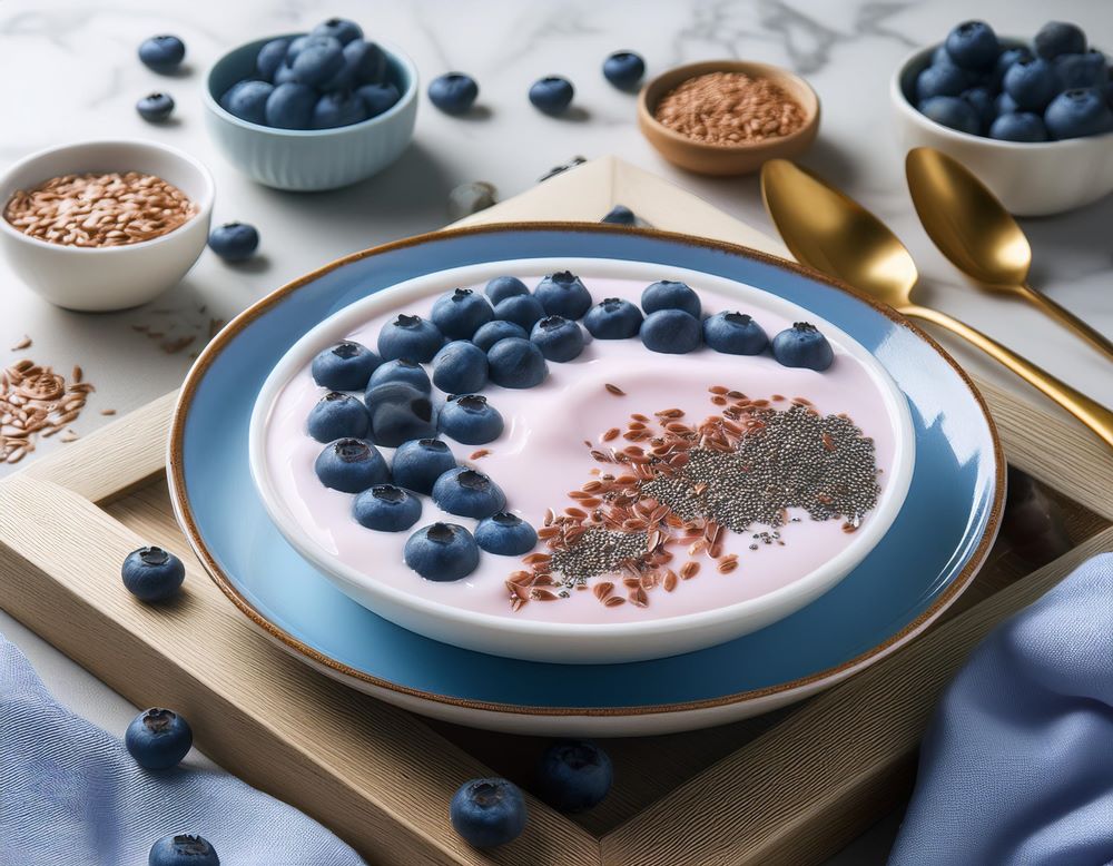 Vierte el yogur en un bol y añade los arándanos y las semillas de lino. Remueve bien.