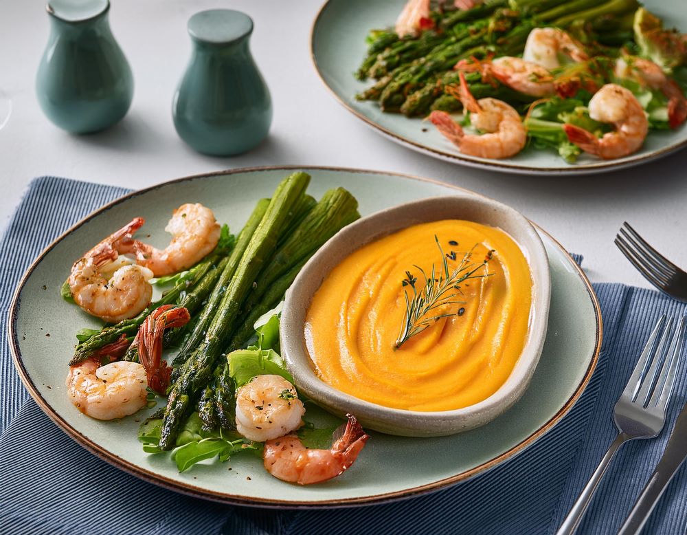 Asa los espárragos a fuego medio hasta que estén tiernos y combínalos con los langostinos en una ensalada.