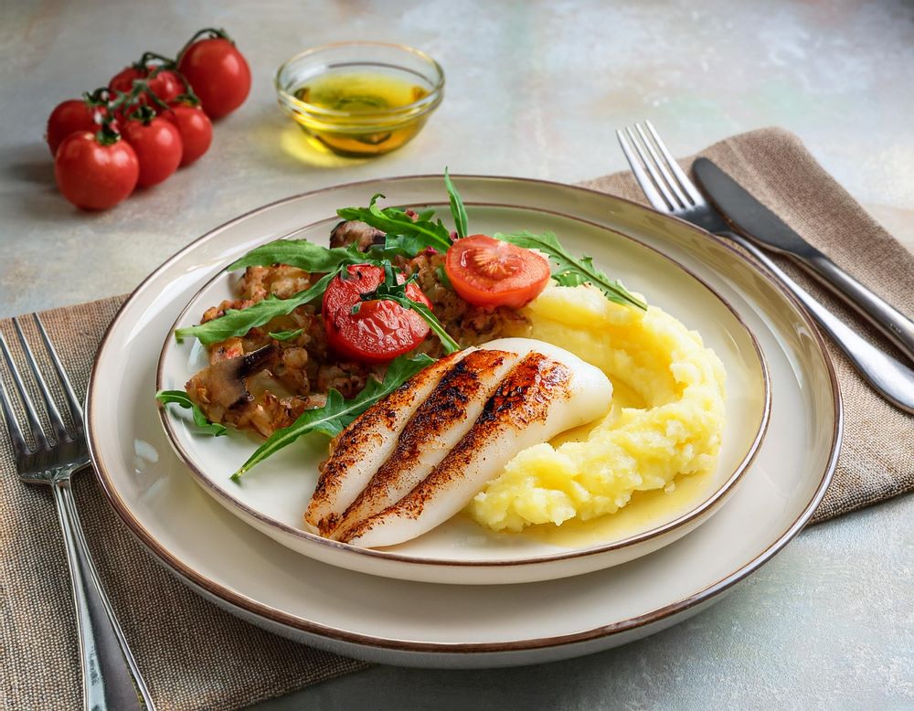 Almuerzo: Calamares a la Plancha con Puré de Patata y Ensalada
