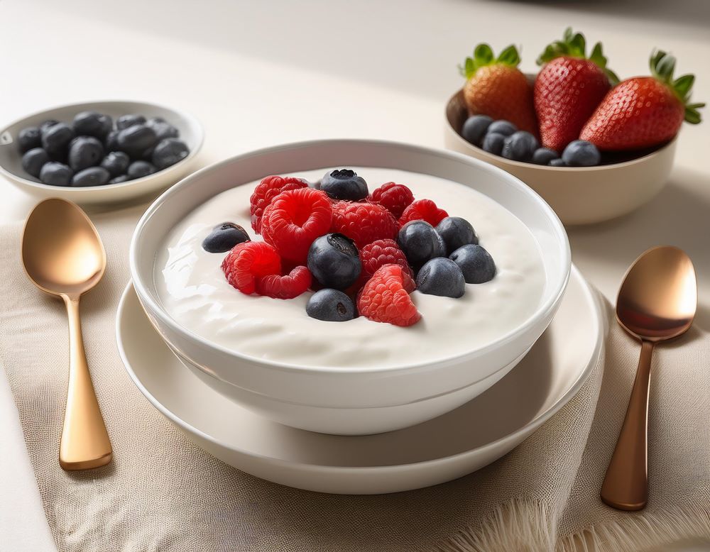 Coloca el yogur desnatado en un bol y añade los frutos rojos.