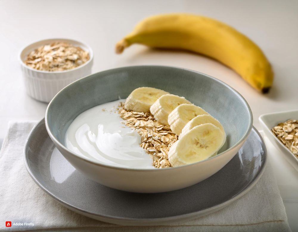 Corta el plátano en rodajas y agrégalo al yogur junto con la avena. Consejo: Para un toque de sabor extra, añade una pizca de canela.